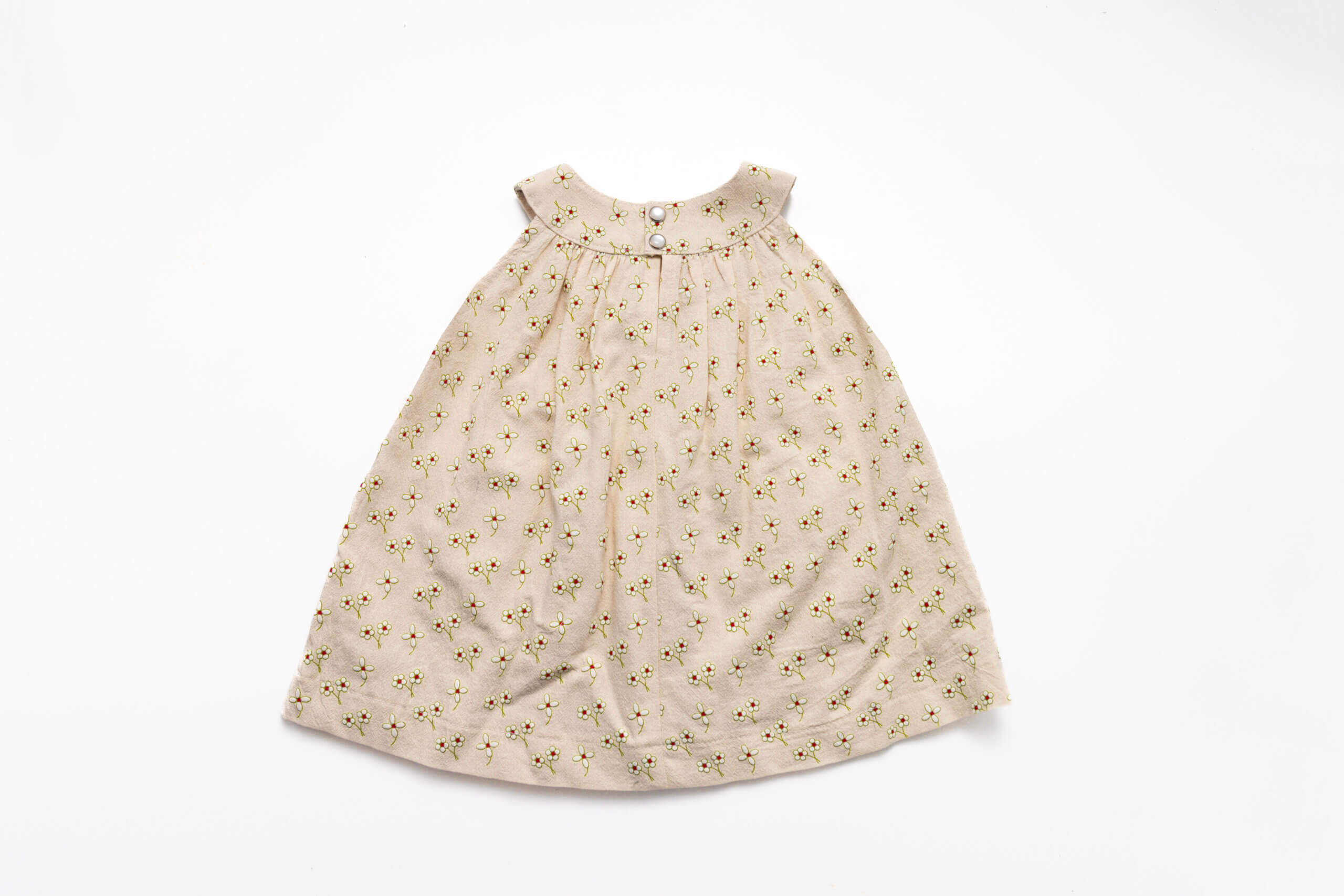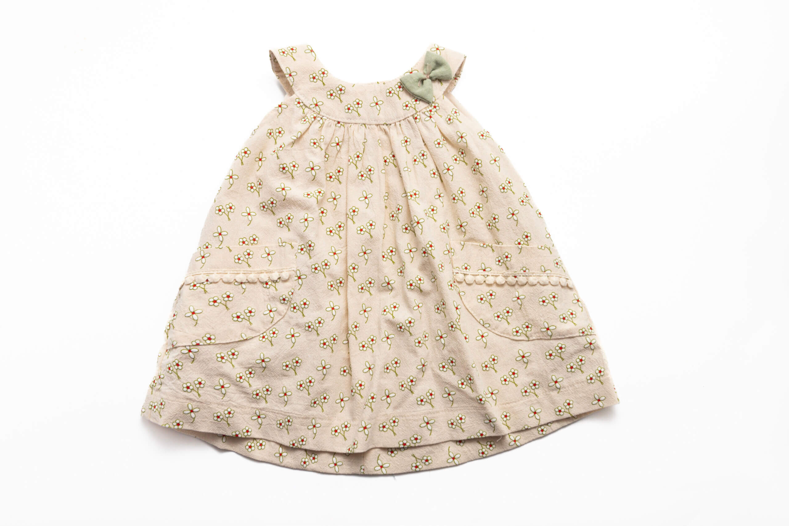 A sweet sleeveless dress made from soft, breathable cotton. Featuring a delicate floral print, gentle gathers at the neckline, front pockets with lace trim, and a charming bow detail.