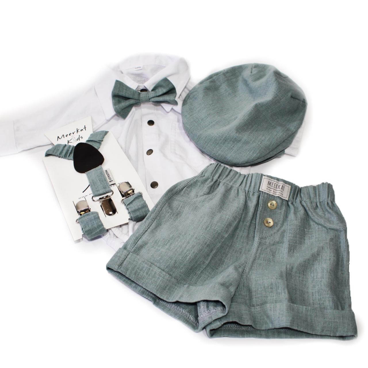 Matching cap,bow and suspenders finishes the vintage look .
